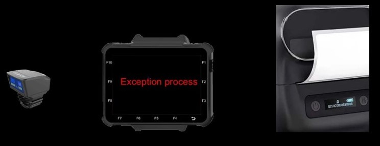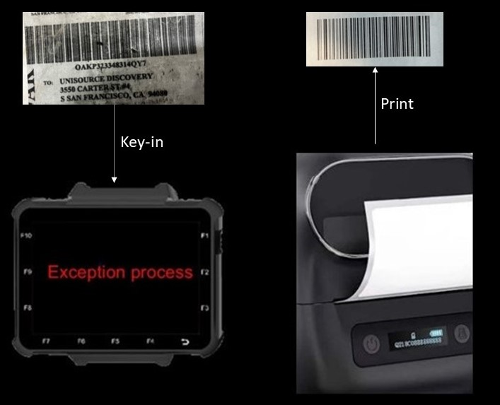 When a package sorter encounters an unreadable barcode, they place it in an exception-handling container. A designated worker will then use a wearable computer to key in the barcode numbers. A portable label printer will take the barcode information and print a new sticker with a clear barcode. After printing, the label will be applied to the package and returned to the sorting area for re-sorting. This avoids having each sorter key in faulty barcodes and reduces steps for drivers further along the delivery process.