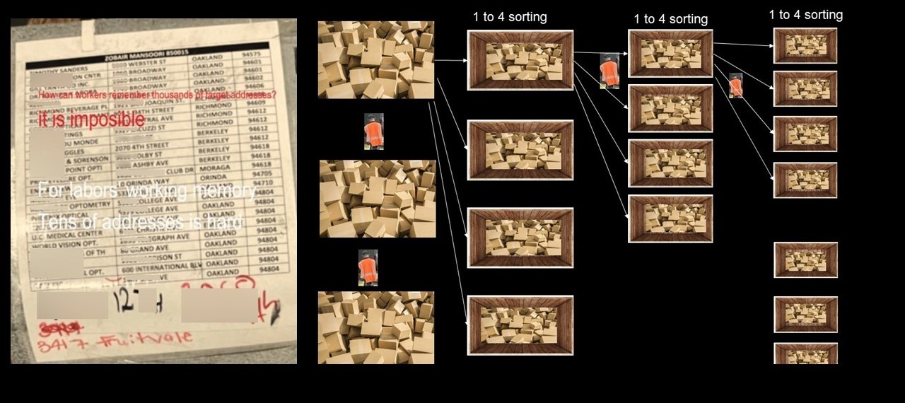 Because human memory and information retrieval capabilities are highly limited, multiple sorting processes are required before packages are assigned to specific drivers. Each manual sorting step can only categorize packages into 4-5 zones. For example, a warehouse with 50-60 drivers needs three-step sorting. What would happen if the business expands to more than 200 drivers? That would require four-step sorting. This not only wastes a lot of time and energy and delays delivery, but also increases the risk of lost, damaged, or delayed packages, all due to multiple sorting steps.